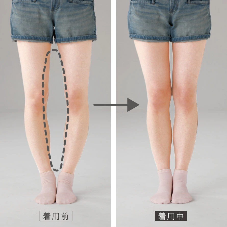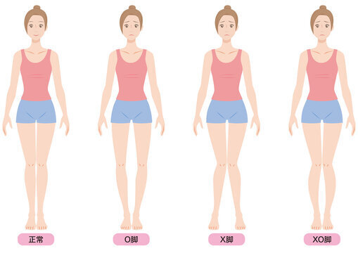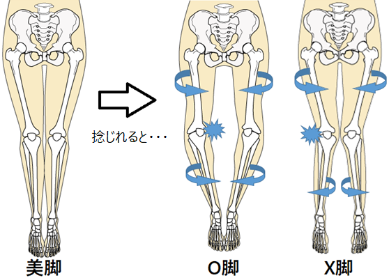股関節が内側に捻れながら、膝が外に広がり、膝の向きがつま先より内側に向いてしまった結果、膝も内くるぶしがくっつかない状態をO脚と定義しています。X脚は股関節が内側に更に捻じられて、膝がくっつのに内くるぶしがくっつかず、膝の位置が完全につま先より内側にある状態をX脚と定義しています。